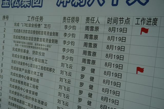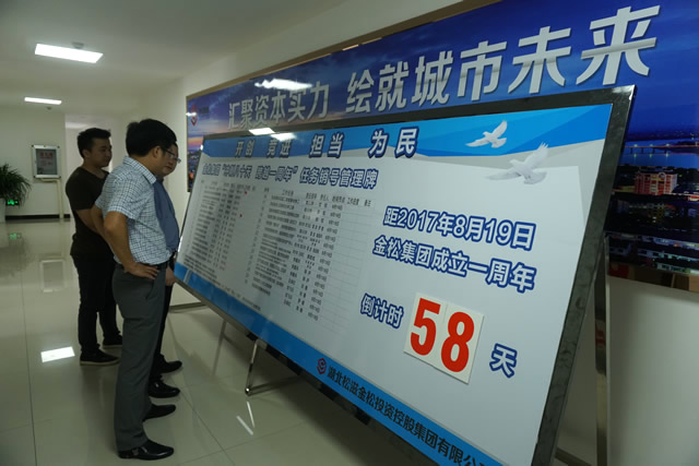 金松集團“沖刺八十天 跨越一周年”活動自6月1日正式啟動以來,集團公司各部室、各子公司迅速領(lǐng)受任務(wù),科學(xué)制定工作計劃,倒排工期,掛圖作戰(zhàn),確定的30項重點工作任務(wù)快速推進,項目建設(shè)呈現(xiàn)出“你追我趕”的強勁態(tài)勢。截止目前,10億元“17松滋金投債”發(fā)行和1.3億元白云新城棚戶區(qū)改造貸款項目兩項任務(wù)已率先完成。
