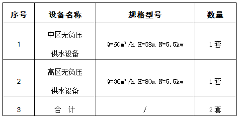 3、項(xiàng)目?jī)?nèi)容:金投•奧體莊園項(xiàng)目無(wú)負(fù)壓供水設(shè)備(具體內(nèi)容見下表)包括運(yùn)輸、調(diào)試、檢驗(yàn)、培訓(xùn)以及售后服務(wù)等全部相關(guān)服務(wù)工作。