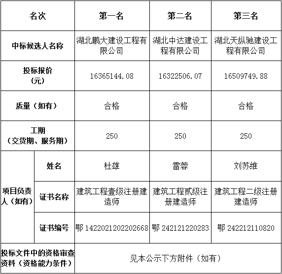 金投?彩虹灣一期(S1號樓綜合商業(yè))及配套工程于2022年12月19日在湖北省電子招投標(biāo)交易平臺發(fā)布招標(biāo)公告,2023年01月31日在松滋市開標(biāo)室(1)開標(biāo),并于2023年01月31日完成評標(biāo)工作。根據(jù)評標(biāo)委員會提交的評標(biāo)報告,湖北松滋金投置業(yè)有限公司已經(jīng)確認(rèn)評標(biāo)結(jié)果,現(xiàn)進(jìn)行評標(biāo)結(jié)果公示。