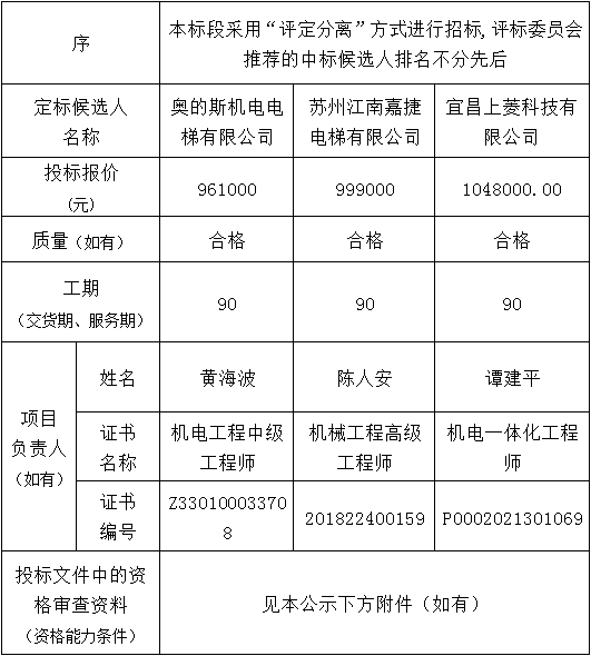 金投?彩虹灣一期(S1號樓綜合商業(yè))及配套工程金投?彩虹灣(一期S1#樓綜合商業(yè))電梯采購及安裝項目于2023年11月14日在湖北省電子招投標(biāo)交易平臺發(fā)布招標(biāo)公告,2023年12月11日在松滋市開標(biāo)室(2)開標(biāo),并于2023年12月11日完成評標(biāo)工作。根據(jù)評標(biāo)委員會提交的評標(biāo)報告,湖北松滋金投置業(yè)有限公司已經(jīng)確認(rèn)評標(biāo)結(jié)果,現(xiàn)進(jìn)行評標(biāo)結(jié)果公示。