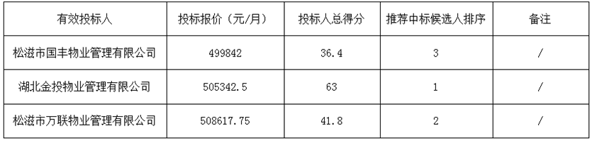 金投•新城壹品前期物業(yè)服務(wù)項目于2019年08月03日在松滋新聞網(wǎng)(網(wǎng)址:http://www.songzinews.net)(媒介名稱)上發(fā)布招標公告,2019年09月12日在松滋市樂鄉(xiāng)凱瑞大酒店五樓會議室開標,并于2019年09月12日完成評標工作。根據(jù)評標委員會提交的評標報告,湖北松滋金投置業(yè)有限公司已經(jīng)確認評標結(jié)果,現(xiàn)進行評標結(jié)果公示。