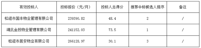 金松•尚含綠城前期物業(yè)服務(wù)項(xiàng)目于2019年08月04日在松滋新聞網(wǎng)(網(wǎng)址:http://www.songzinews.net)(媒介名稱)上發(fā)布招標(biāo)公告,2019年09月11日在松滋市樂鄉(xiāng)凱瑞大酒店五樓會(huì)議室開標(biāo),并于2019年09月11日完成評(píng)標(biāo)工作。根據(jù)評(píng)標(biāo)委員會(huì)提交的評(píng)標(biāo)報(bào)告,湖北松滋金投置業(yè)有限公司已經(jīng)確認(rèn)評(píng)標(biāo)結(jié)果,現(xiàn)進(jìn)行評(píng)標(biāo)結(jié)果公示。
