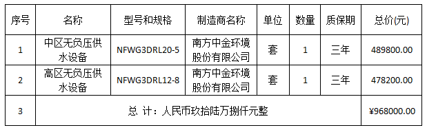 受湖北松滋金投置業(yè)有限公司的委托,湖北中興方和工程咨詢有限公司于2020年1月19日對湖北松滋金投置業(yè)有限公司金投•奧體莊園項目無負壓供水設備項目(第二次)采用競爭性磋商方式進行采購,現(xiàn)將本次采購的成交結果公告如下: